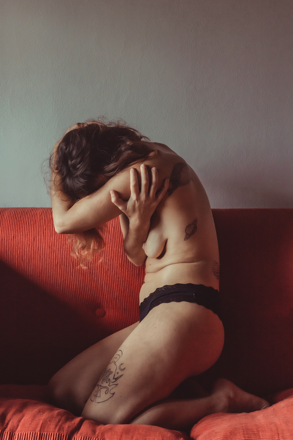 Session in the red chair, natural light. Duo composition looking to create images in bond with the other, even when alone. photografer Matias Lausada