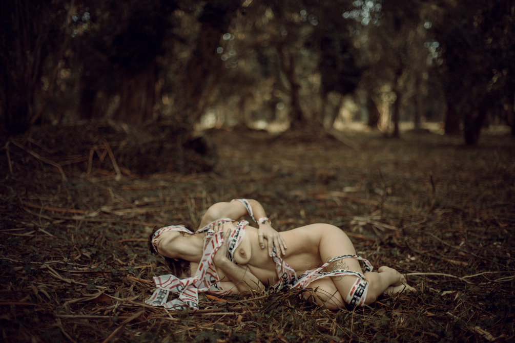 8 fotografias en exterior. Bosque, mujer, cinta de peligro