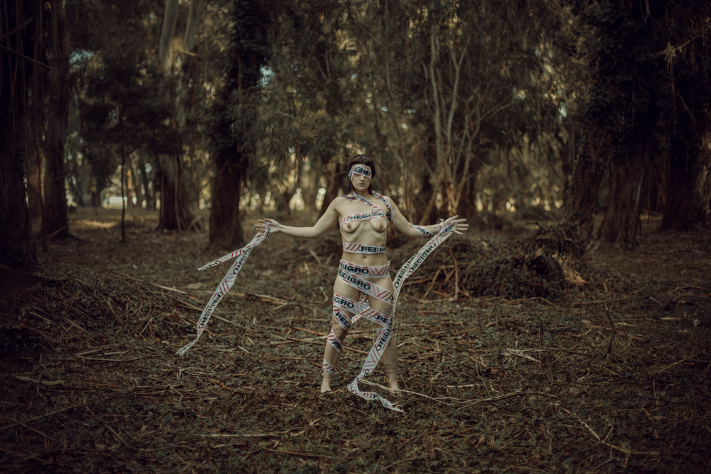 Composición con cinta de peligro, buscando metaforizar la sexualidad reprimida en el cuerpo de las mujeres.